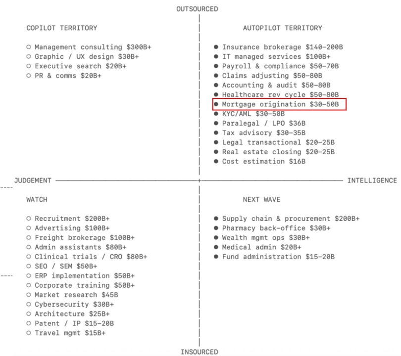 Not “partially automated.” Not “AI-assisted.” Fully AI. Sitting there alongside insurance underwriting and paralegal work, and a handful of other professions that Sequoia’s partners apparently believe will be substantially performed by machines within a few years.